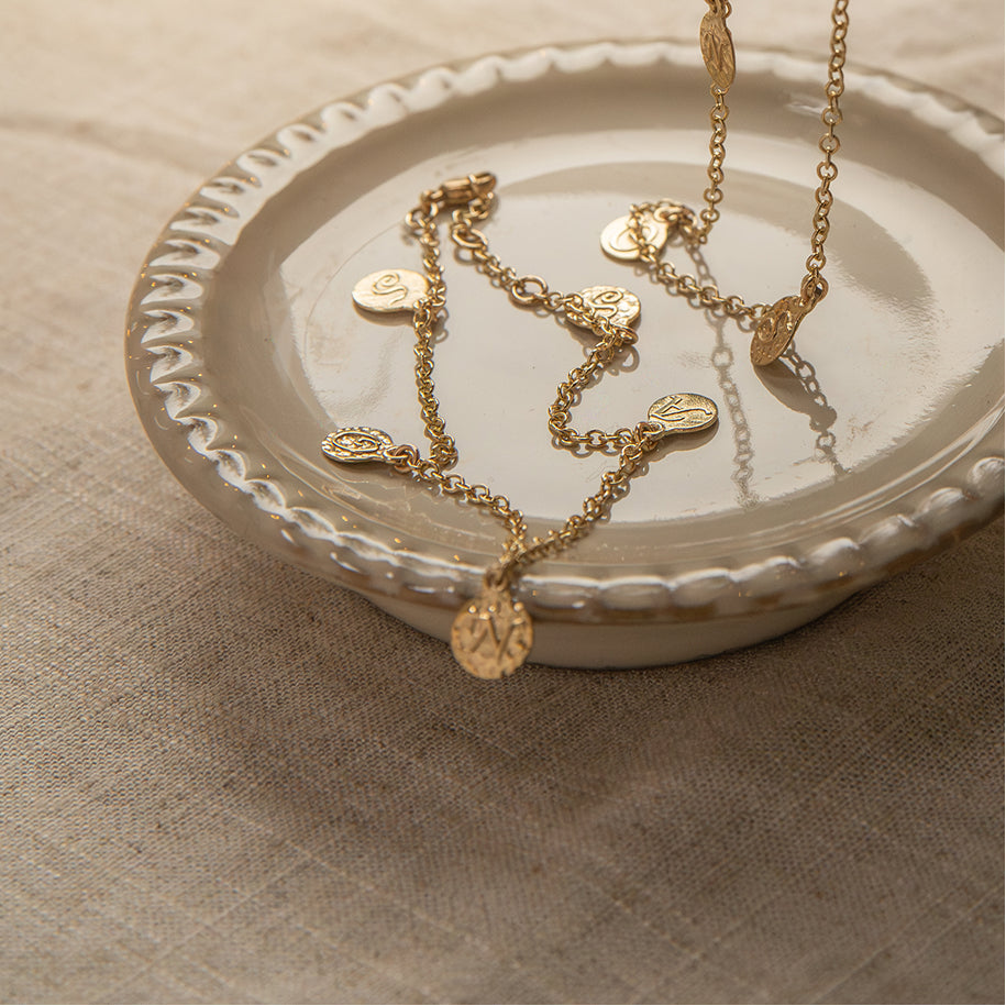 Precious felicity everyday. A beautiful solid gold bracelet to remind you to count your blessings. Each of the five little discs has a letter, spelling the joyful Irish word Sonas. Happiness. Gift someone special, or treat yourself, to this bracelet to cherish forever. Adjustable to fit most wrist sizes. Wear with the matching Sonas necklace for a truly delightful set.